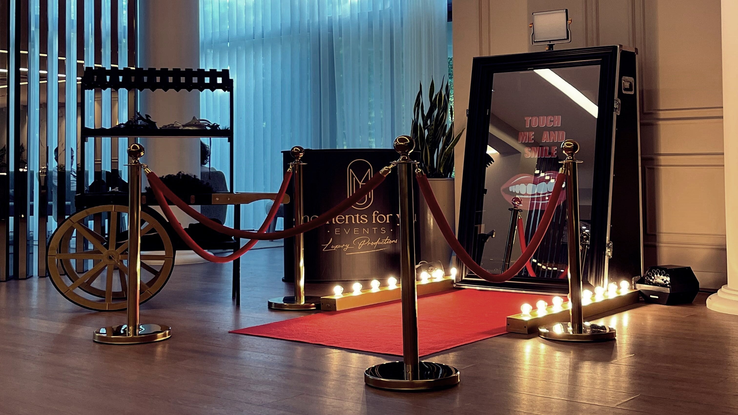 Apresentamos o Photobooth Magical Mirror, uma adição cativante ao seu evento que traz encanto e diversão a um nível totalmente novo. Na Moments For You - Luxury Productions, apresentamos esta experiência inovadora e interativa de photobooth para adicionar um toque de magia aos seus momentos especiais.